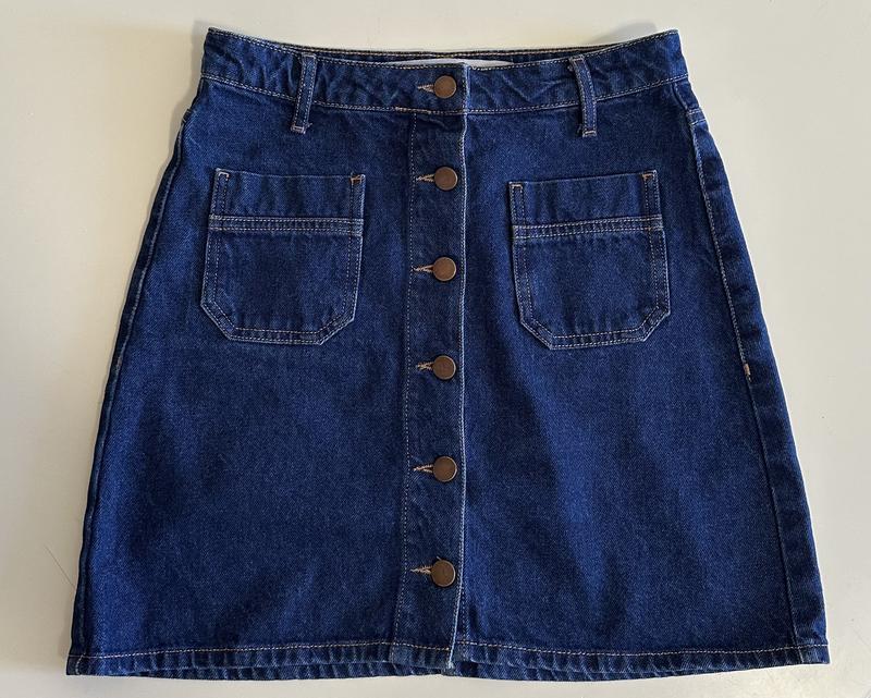 Джинсовая юбка с накладными карманами по заду и переду. Обхват талии - 68 см Обхват стегон - 92 см Длина изделия - 41 см