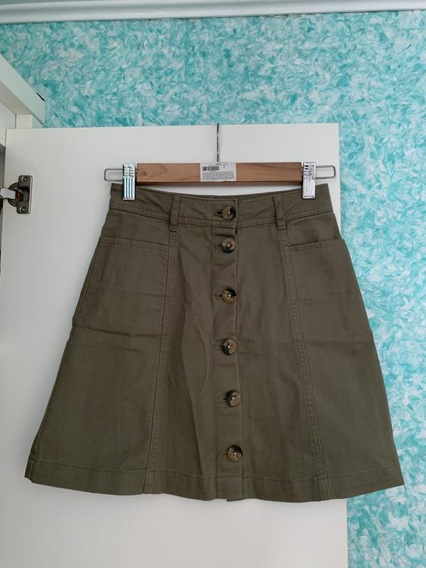 хакі спідниця з гудзиками, трішки пом’ята але я це виправлю при відправлені🥺 розмір: 32 (хс) (ххс)
