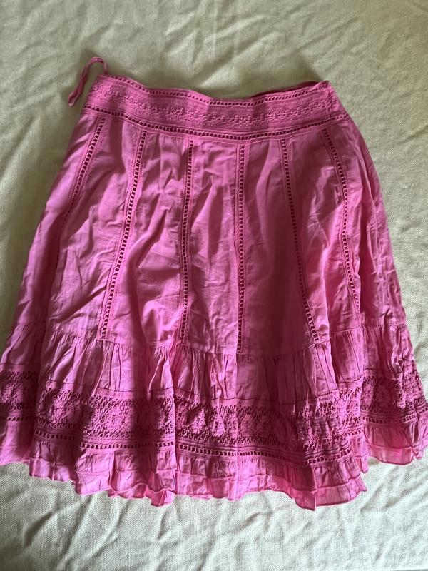 Мини юбка в розовом цвете, которая интересно смотрится благодаря вязаным вставкам. Ткань очень легкая Размер:S/M Цена: 399 грн