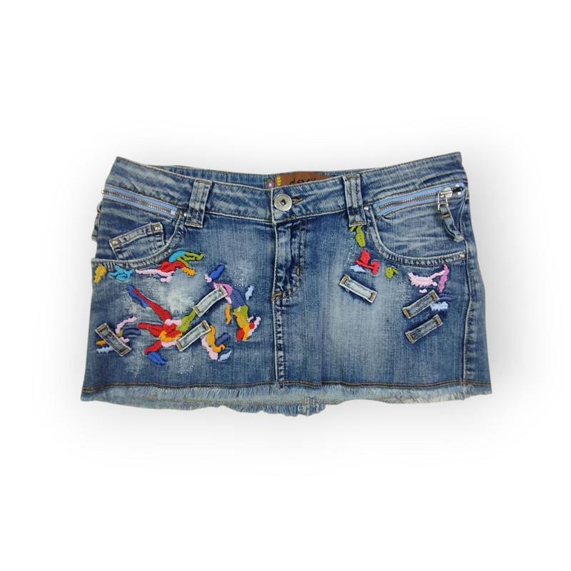 Джинсовая женская юбка мини Deploy голубого цвета с разноцветной вышивкой. Пять карманов, застежка молния и пуговица. Состояние б/у, в отличном состоянии Производитель Deploy Размер S (44) Цвет голубой Состав 99% хлопок, 1% эластан Замеры: полуобхват талии 39 см, длина 26 см