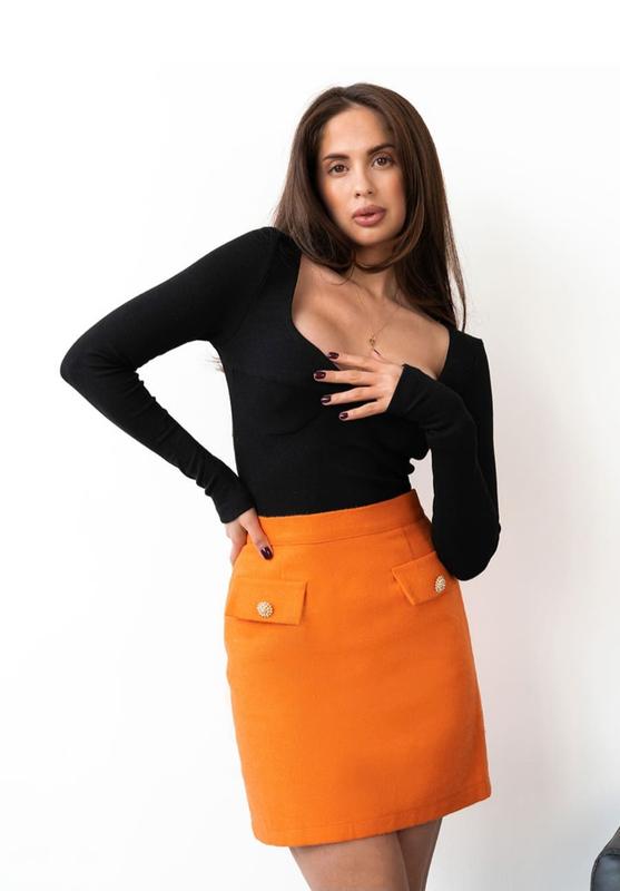 Оранжевая юбка мини с клапанами, декорирована пуговицами. Производится из хлопка с полиэстером. фиксируется с помощью пуговицы и молнии на спинке. Размер: XS: длина изделия - 45 см, ширина по талии - 33 см