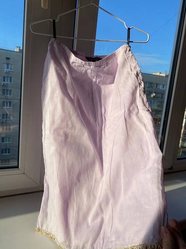 Нежный свет сиреневая юбка украшена с края бисером Есть нижняя юбка, видны силуэты ног сквозь ткань Полу обхват талии 33 см Полу обхват бедер 44 см Длина 60 см