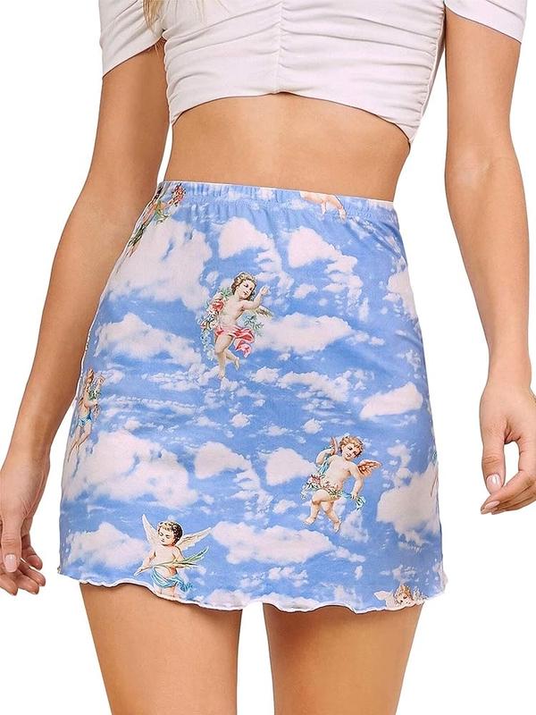 Юбка голубая с ангелами и облаками мини юбка женская летняя юбочка с высокой посадкой