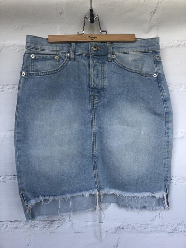 Короткая джинсовая юбочка. Трендовый необработанный низ. Цвет - светло голубой. Сзади с одной стороны отбеливаемость несколько светлее с одной стороны (последнее фото) Джинсовая юбка, состояние идеальное. Джинс плотный. Тянется Длина 44 спереди Длина 49 сзади Ширина по поясу 48 Ширина в стегнах 47