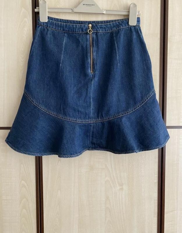 Стняя джинсовая юбка с воланом. Средняя плотность ткани. По поясу 36 см, по бедрам 48 см, длина 45 см. Состояние новой вещи