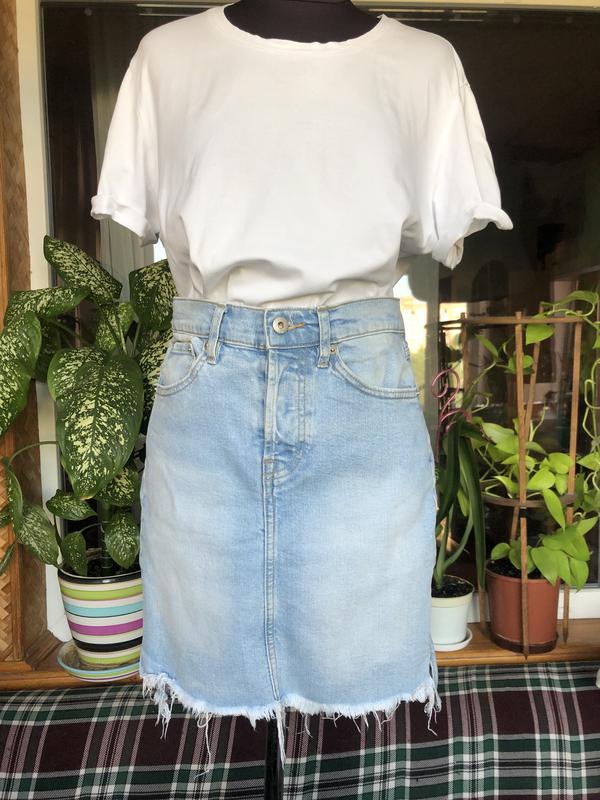 Короткая джинсовая юбочка. Трендовый необработанный низ. Цвет - светло голубой. Сзади с одной стороны отбеливаемость несколько светлее с одной стороны (последнее фото) Джинсовая юбка, состояние идеальное. Джинс плотный. Тянется Длина 44 спереди Длина 49 сзади Ширина по поясу 48 Ширина в стегнах 47