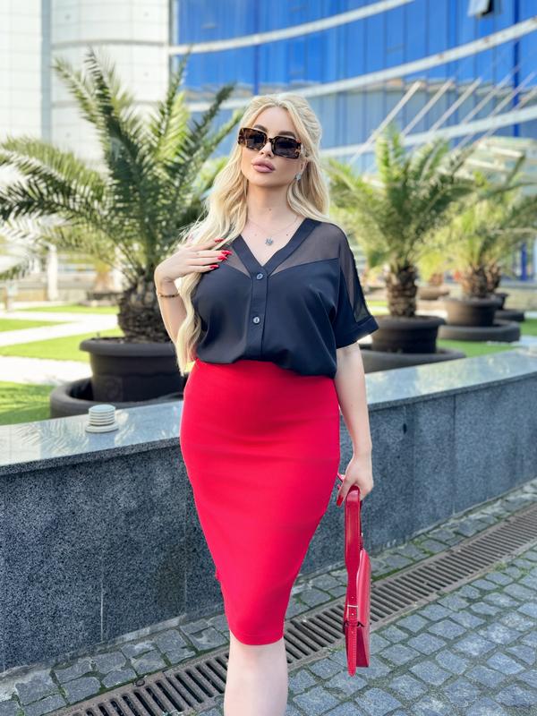 Юбка карандаш Классическая юбка, подойдет как на праздничный выход так и на каждый день! Имеет функциональную молнию на поясе. 1+5 Размеры: 50-52,54-56,58-60 Цвет: красный и черный Тканина: стрейч коттон Цена: 610 грн. Блузка с интересным дизайном 3# Размеры : 48-52,54-58 Ткань: супер софт + сетка Цвет: белый и черный Цена: 650 грн