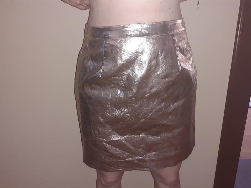 спідниця, ошатна, перламутрове покриття, відтінок бронза. Сток , на підкладці ,фасон- трапеція, є незначні нюанси- на підкладці є трохи плям, на лицевій стороні спереду 1 точка з заду в 2-3 точках, трохи зчухалося покриття, див фото, в очі не кидається.