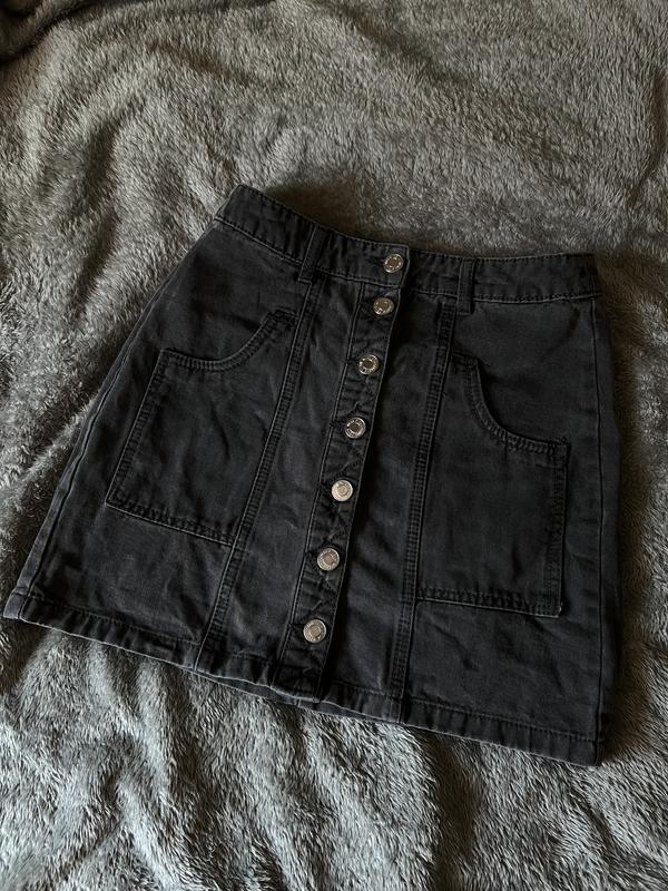 Джинсовая юбка в длине мини, серого цвета с серебряными пуговицами. Бренд Stradivarius. Размер 36. Состав: 100% коттон Замеры: Длина - 39 см Ширина в талии спереди - 34 см Ширина в бедрах спереду - 45,5 см