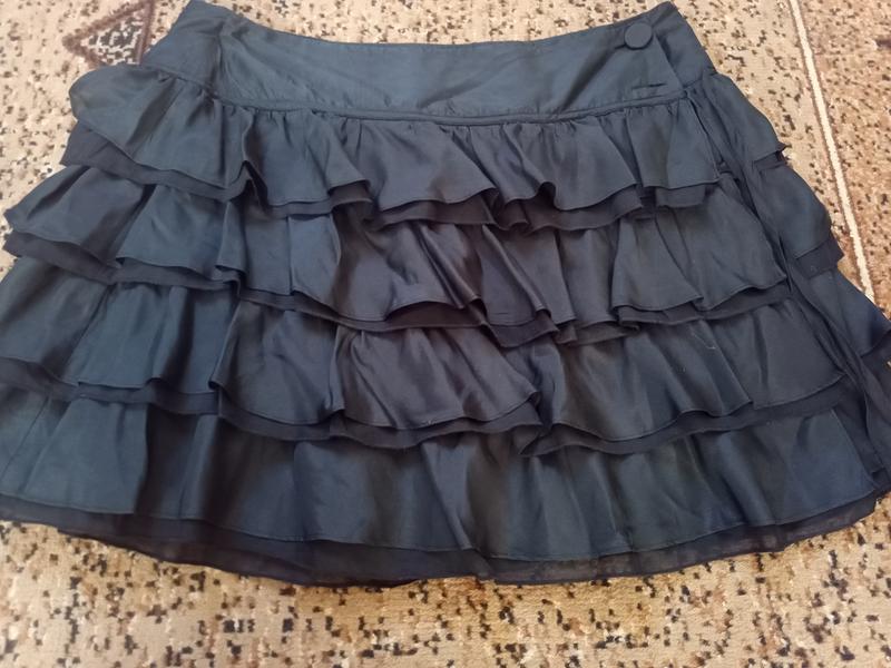 шелковая юбка на запах, черного цвета. Размер по набору 4. Юбка мини. Отсутствие одной пуговицы (на фото видно). Состояние вещи красивое. Состав вещи: верх - шовк, подклад -коттон.