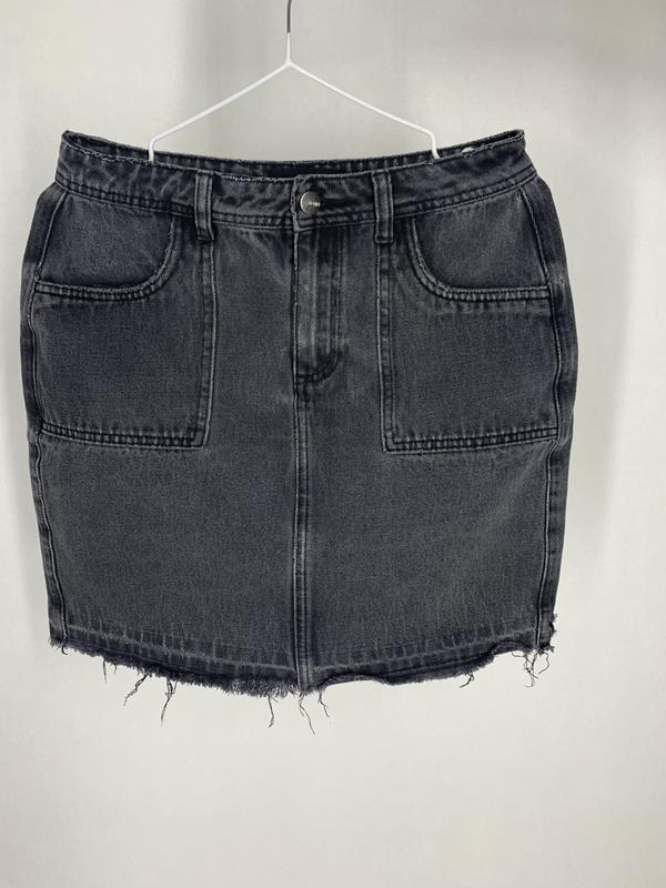 Спідниця графітового кольору у розмірі 38 (на С-М) Довжина 42 см, напівобхват талії 36 см, напівобхват стегон 48 см Виконана з щільного деніму, по низу необроблений край Стан ідеал