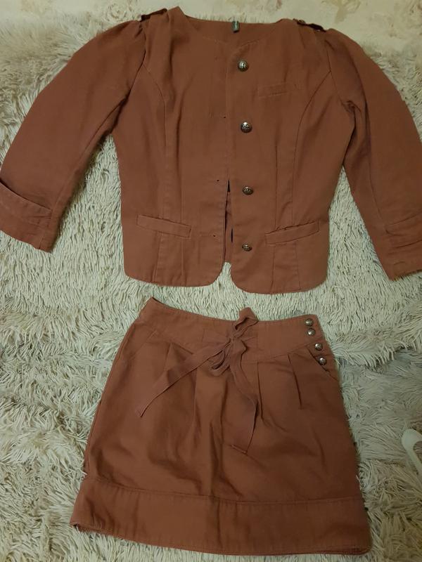 Костюм (юбка и пиджак), 34 европейский размер. Длинна пиджака 48 см.Плечи 35 см. Талия 33 см. Грудь 40 см. Юбка - длина 40 см.Рукав три четверти. Дефектов нет. Состояние идеальное.