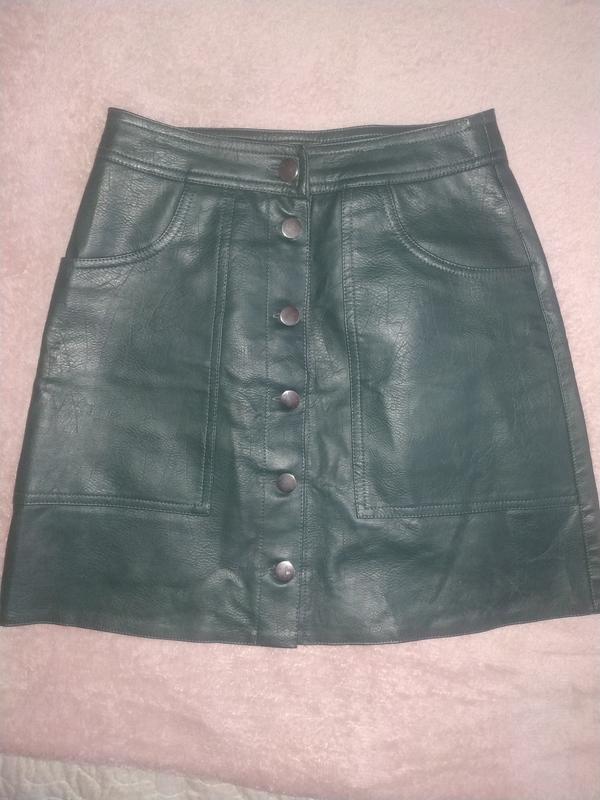 Темно-зеленая юбка из искусственной кожи. Она имеет высокий пояс и серебряные пуговицы спереди. Изготовлена из качественного материала, напоминающего настоящую кожу, эта юбка придаст смелости вашему гардеробу.