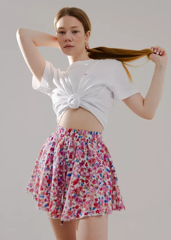 Очень легкая юбочка от Goldi доступна к заказу! Размеры: XS, S, M, L Состав: 100% хлопок Цвет: красно-розовые цветы с голубыми листьями