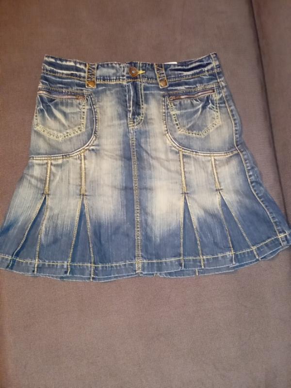 джинсова спідниця вище колін в складки ,імітація потертості жовтого кольору розмір 40 європейський , ідеальний стан,всі заклепки і блискавки не пошкоджені,дуже гарна якість,має гарний вигляд