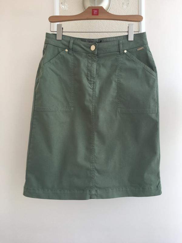 Красивая и стильная юбка марки «Marks & Spencer» Per Una. Цвет насыщенный зеленый (хаки), как на 4-е фото, на всех остальных не передаётся. Фурнитура золотая. Тканина цупка. Есть 4 кармана. Стан идеален, есть только один дефект, на последнем фото. Размер: англ.12/ евр.40/ укр.46 Замеры: Ширина по поясу - 39-40 см Поб - 52 см Ширина по низу - 55 см Длина - 61 см Ткань эластичная, немножко тянется Склад: 97% бавовна, 3% еластан Отправка после предоплаты 150 грн или полной оплаты, по почте / безопасная оплата
