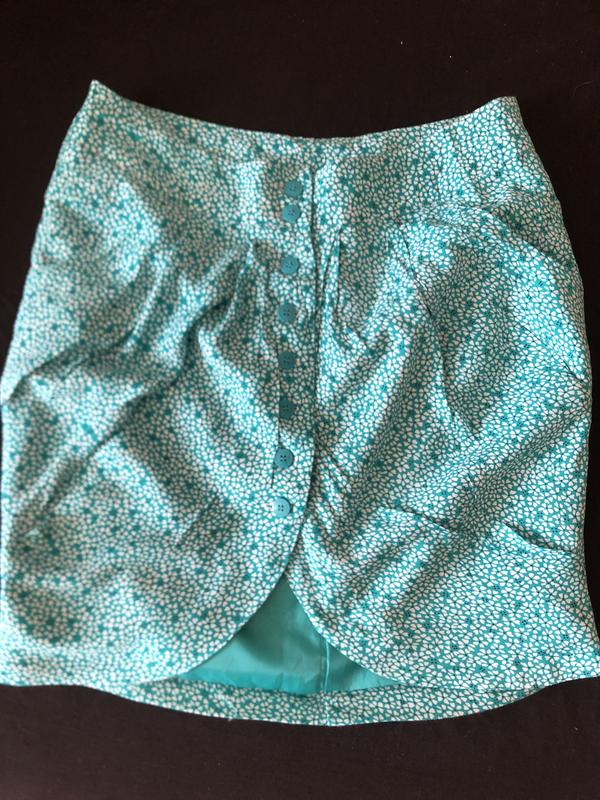 Яркое лазурное цвета с белыми цветочками, в талии 41 бедра 51 длина 49