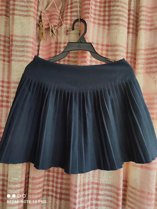Синяя юбка размера S. Не короткая, но не закрывает колени. Имеет орнамент в виде складок. Фиксация с помощью мелкой собачки. При застегивании, лучше осторожно придерживать с двух сторон, чтобы не зажеложала ткань. В эффекте есть маленькая дырка.