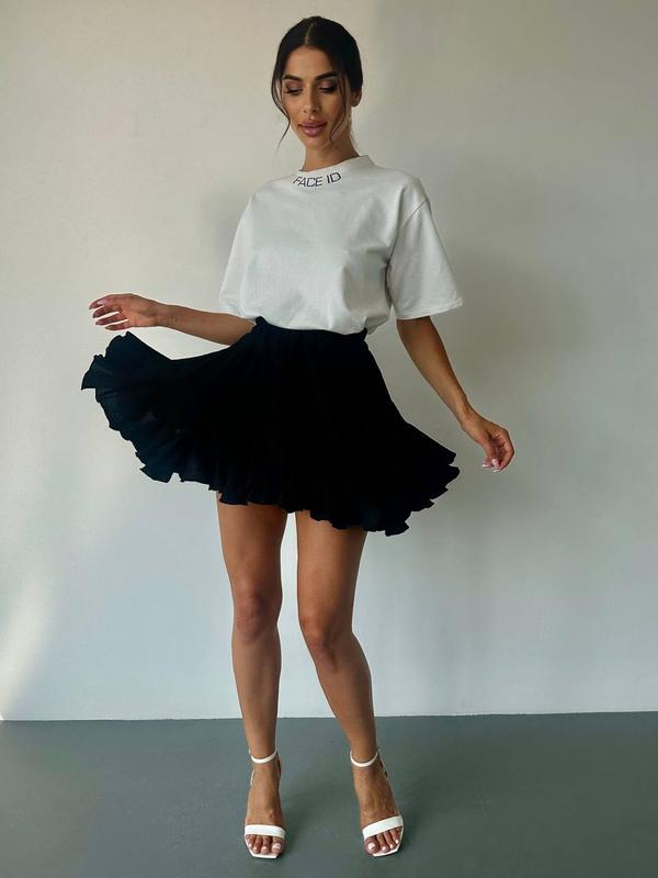 599 грн 🟢ФОТО РЕАЛ🟢 Трендовая юбка 🔝 Model: 831.500.300 Material: софт Color: черный, белый Size: S-L (универсал) Параметри товару: Длина изделия 40 см ОТ 62-90 см ОС 110 см 📌Трендовая юбка-шорты с воланами. Юбка выполнена из качественного софта, снизу для удобства есть вшитые шортики из основной ткани,пояс юбки перестрочен как на фото.