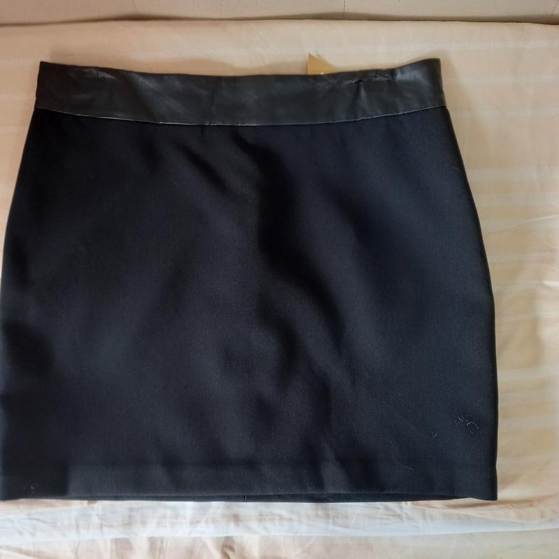 Чорна спідниця з поясом зі штучної шкіри.тканина плотна ,склад: поліестер,віскоа і еластан.Заміри :об.тал. 40см., об бедер52см., довжина 42см.