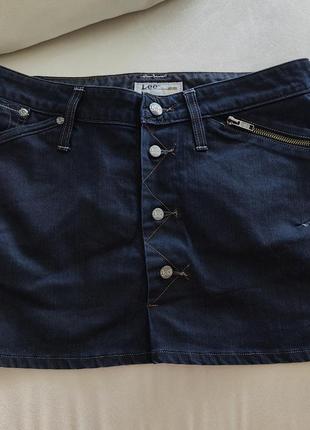 Джинсовая мини-юбка, застежка на пуговицы спереди, карманы на молнии. Цвет: темно-синий. Материал: хлопок.