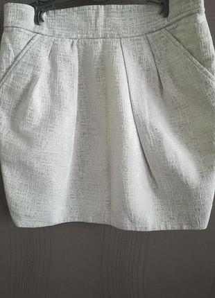 Короткая нарядная юбка, размер на этикетке L, но скорее пойдет на М. Если надо, напишу замеры. Платье на подкладе, выполненное из очень качественной ткани, с легким серебристым отблеском, за счет чего выглядит празднично и привлекательно.