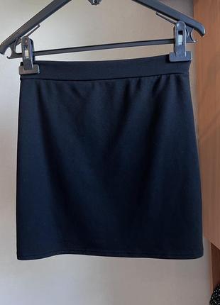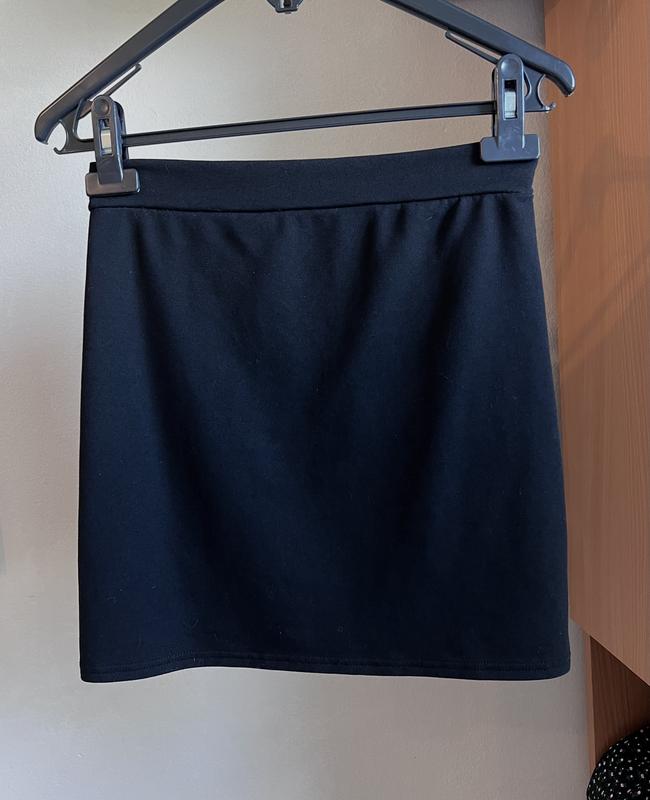 Черная мини юбка с небольшим разрезом сбоку, размер S, приталенная, без замков или резинок, есть также к ней комплектный черный топ. Без бренду