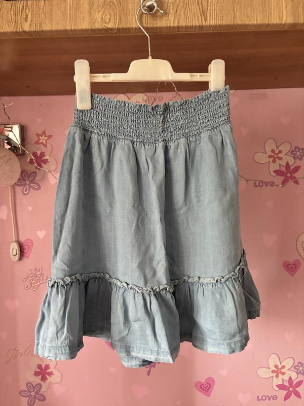 На картинке представлена юбка светло-голубого цвета, выполнена из легкого и, вероятно, натурального материала, например хлопка или льна. В верхней части юбки есть широкая эластичная вставка из складывания, которая позволяет юбке плотно прилегать к талии. Нижняя часть юбки оформлена воланами, что придает ей легкость и женственность. Это легкая, летняя модель, которая подойдет для повседневной носки.