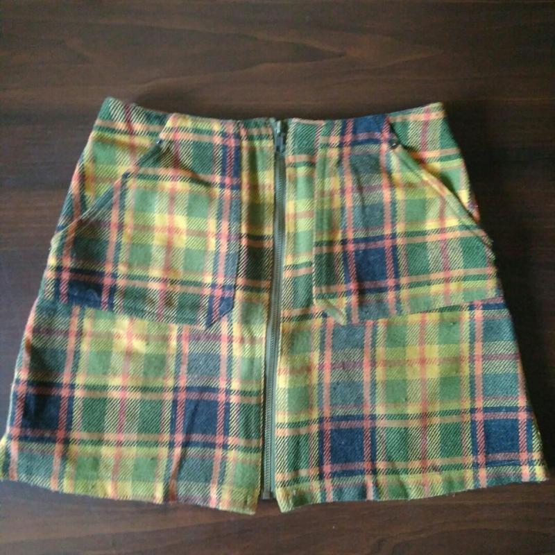 Юбка на застежке спереди, имеет карманы и спереди и сзади, обхват талии 68-70 см, длина 38 см.