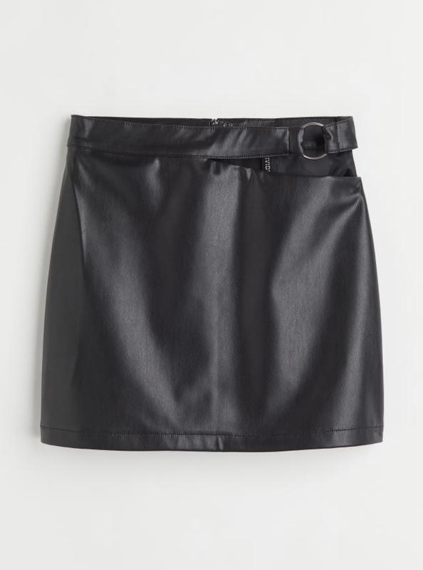 Юбка мини H&M с вырезом и декоративным металлическим кольцом, сзади скрытая молния. На подкладке, экокожа, размер S. Новая, с бирками.