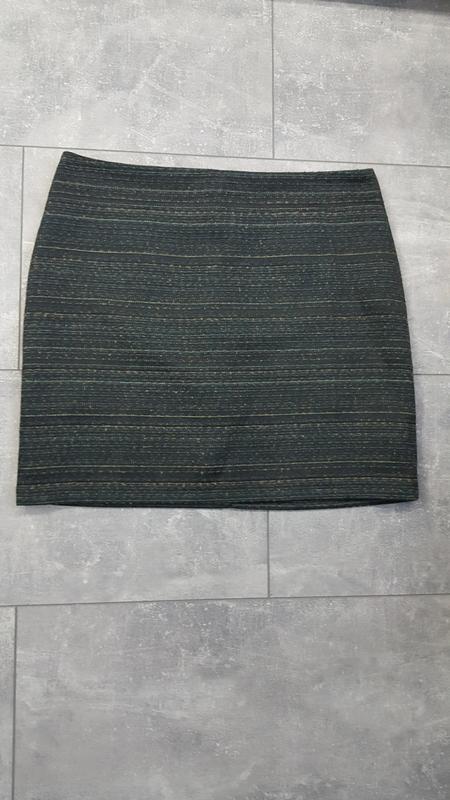 Юбка трапеция. Цвет аквамарин в полоску зеленоголубого, коричневого цветов. Сзади на молнии. Имеет подкладку. Ткань плотная. Замеры: Длина изделия 42см. ПОТ 40СМ. ПОБ 49СМ.