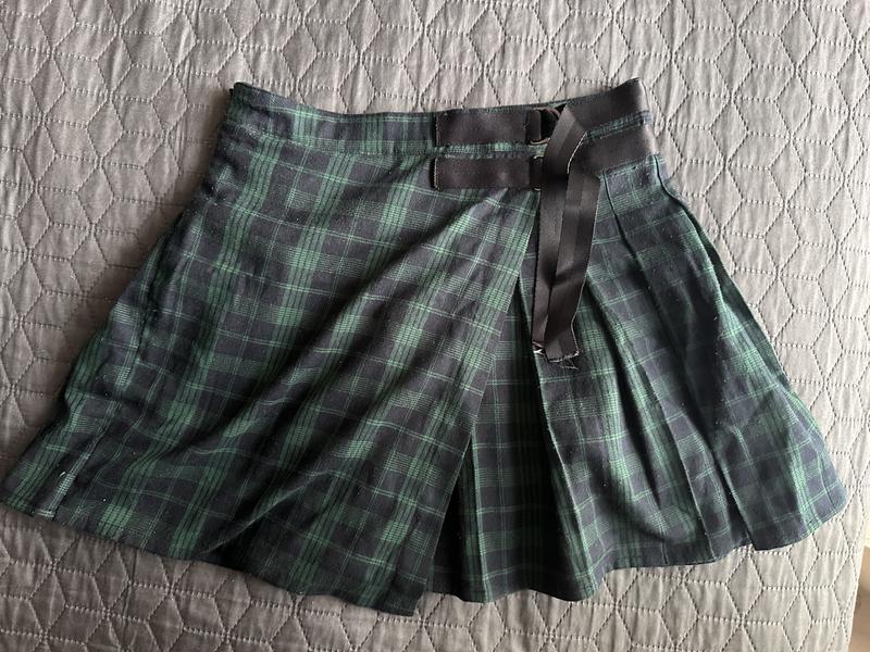 Юбка в клетку, с обманкой-запахом, застегивается сбоку на молнию. Имеет декоративную тесьму. Сделана из ткани, как теплые рубашки Замеры на фото, также ответь на вопрос
