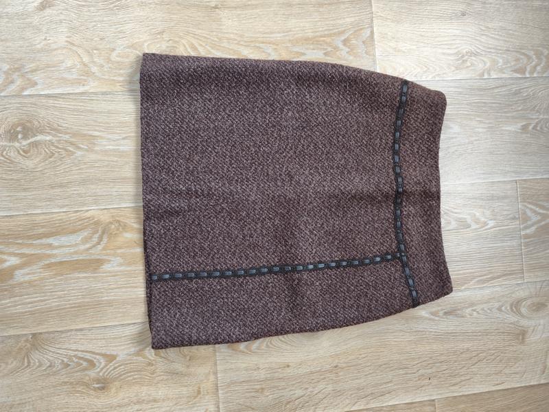 юбка короткая, из натуральной ткани, 80% шерсти, коричневого цвета из переда кожаная лента, на подкладке, вот 80, об 100, длина 54, очень теплая, 200 гр