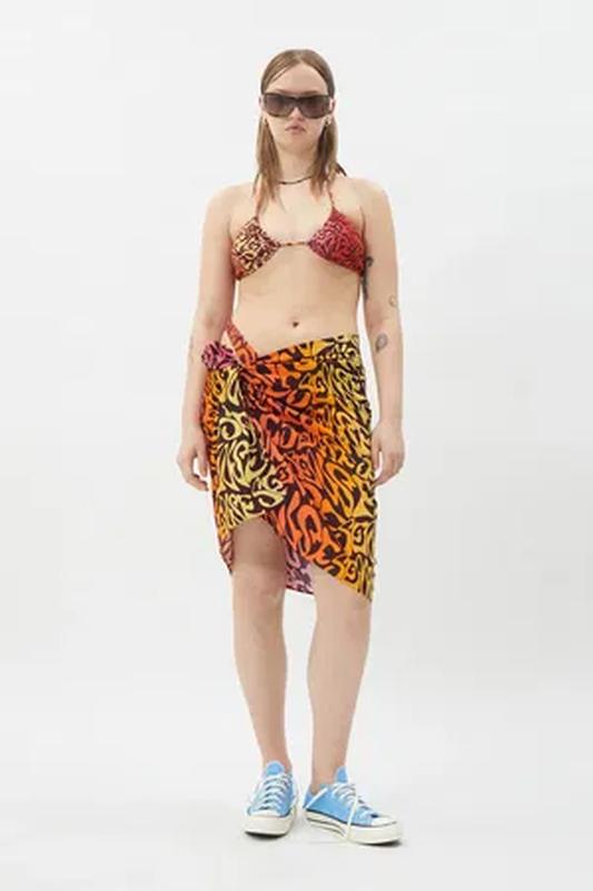 50% лиоцелл, 50% вискоза Выдающийся саронг для пляжных дней, выполнен из мягкого и легкого батиста. Этот предмет в стиле 70-х встречается с 90-ми, имеет психоделический текстовый принт по всей поверхности и размеры 140 см x 70 см.
