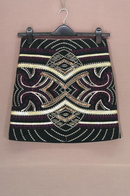 Новая брендовая юбка "George" с вышивкой. Размер uk10/eur38. Без застёжки. Замеры в нерастянутом виде: -ПОТ - 37 см (тянется до 53 см); -ПОБ - 47 см; -ширина внизу - 50 см; -длина - 44 см. Без дефектов. Новая с бирками. *Рост манекена, на котором сделано фото - 185см.