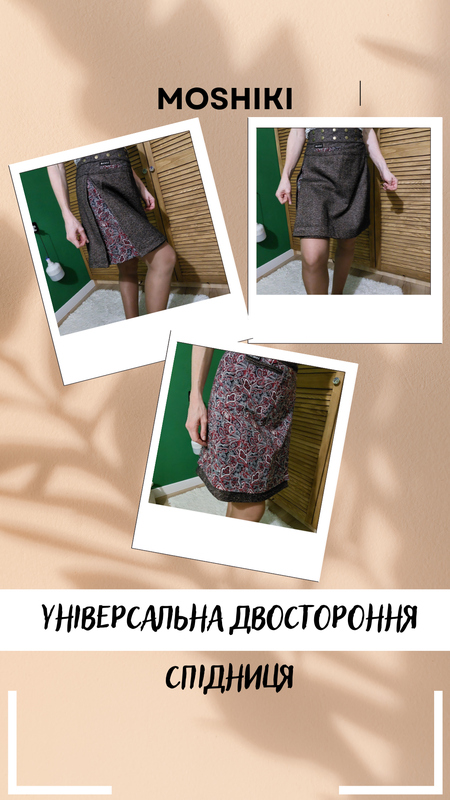 Двостророння спідниця універсального розміру, універсального та стильного дизайну. Спідниця представлена у двох різних стилях: один бік виконано з твідової тканини зі структурованим зовнішнім виглядом в темно-коричневих та ледь помітних золотистих відтінках. А інший бік має візерунок пейслі, у насичених бордових, білих і чорних тонах. Твідовий бік передає вишуканість, ідеально підходить для формального або напівформального одягу. Візерунчастий бік сміливий і художній, підходить для повсякденної або творчої обстановки. Пояс декорований кнопками кольору бронза. З двох сторін є кишені. Склад 100% бавовна. Найменший розмір ПОТ-35см, довжина -50см.