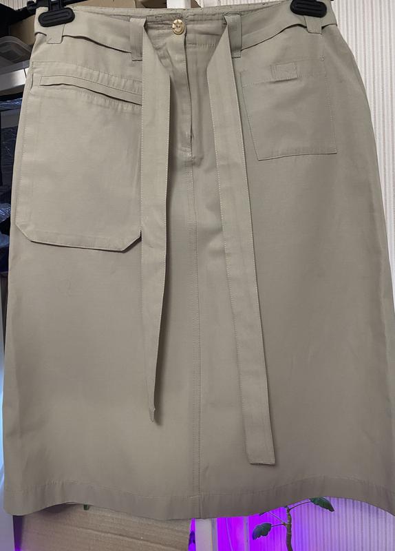 Юбка цвета хаки фирма NEW LOOK; Замеры: талия- 80; бедра- 104; длина- 64; Состав ткани: п/эстер 54%, коттон 46%; Спереди на короткой молнии; многие карманы;