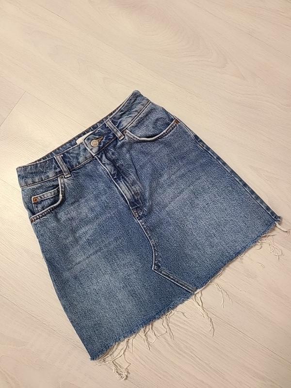 Джинсовая юбка 34 размер, Замеры: пот 32 см, поб 42 см, длинна 40 см. Есть нюанс, маленькое пятнышко, последнее фото.