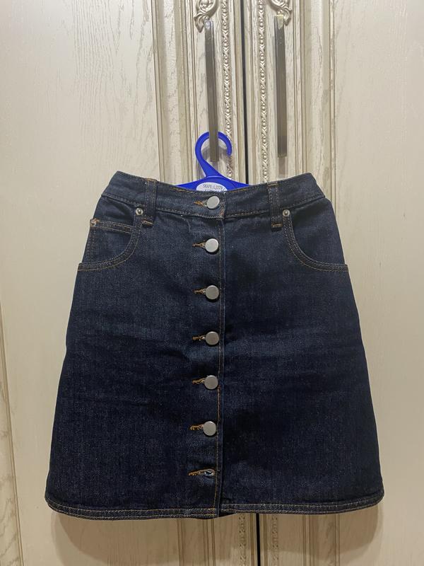 Джинсовая юбочка на пуговицах, не тянется, в темном синем цвете с прошивкой в идеальном состоянии, размер маленький