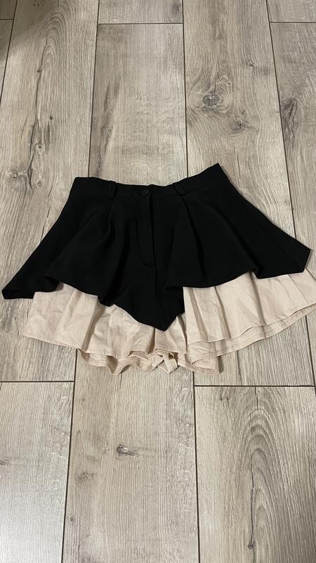 розмір xs; бежеві шортики знизу, чорна спідниця зверху ;є застібка і ґудзик; сезон: весна, літо