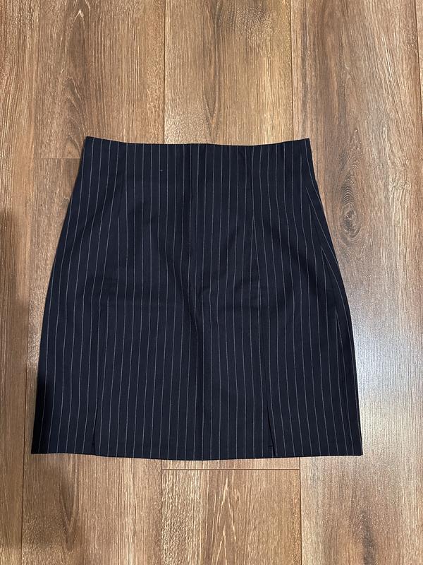 Спідниця, темно синя, в смужку, з двома розрізами спереду.