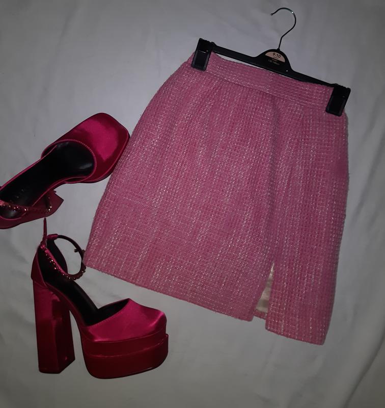 Розовая твидовая юбка с разрезом Высокая посадка Сзади на молнии Длина 44 см ПОТ 31 см ПОБ 46 см