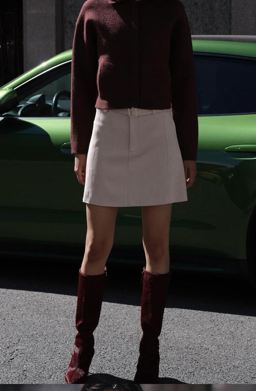 Короткая расклешенная юбка средней посадки из искусственной замши. Шлевки для ремешка и ремешок из той же ткани с металлической пряжкой. Не подшит край в низу. Застегивается на молнию и пуговицы с переда.