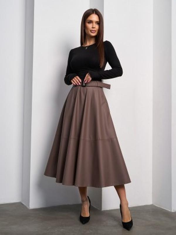 Арт: 14162A_коричневыйВымеры Мы измеряем готовые изделия! Чтобы точно определить размер, сделайте замеры одежды сантиметровой лентой и сравните с таблицей. Полуобхват S M L XL Талия 34 36 38 40 Стегна 78 80 82 84 Длина изделия: 79 Ткань: низкая эластичностьМатериал: Эко-кожа Состав: 79%, полиэстер, 21%, эластанюбка-трапеция с боковыми карманами, изготовлена из эко-кожи. Модель на молнии с расклешенным кроем и миди длиной. Изделие высокой посадки со съемным поясом.