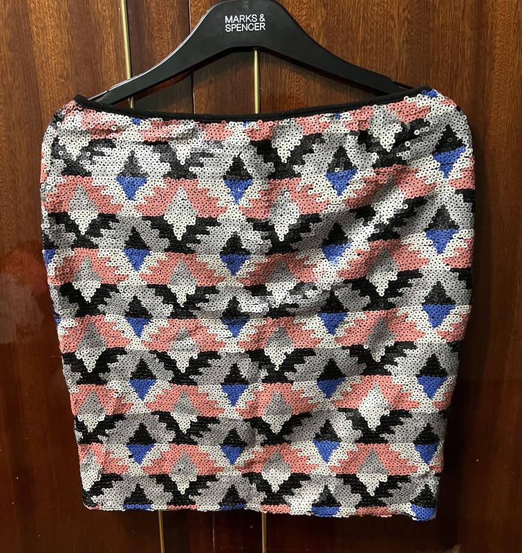 Міні-спідниця зашита різнокольоровими стразами ( повністю); стрази матові;стан чудовий; розміри на фото