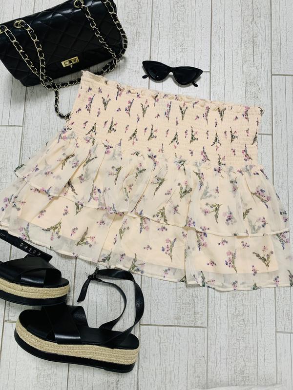 Размер UK 16, наш XL-2XL ✅Замеры: В поясе резинка 44,5-55 очень хорошо тянется Бедра ( мерила по низу по подкладке) 57 Длина 41 Стан идеален, без дефектов и нюансов Цветочный принт🌸 Снизу на подкладке, не просвечивается Супер легкий вариант на лето☀️