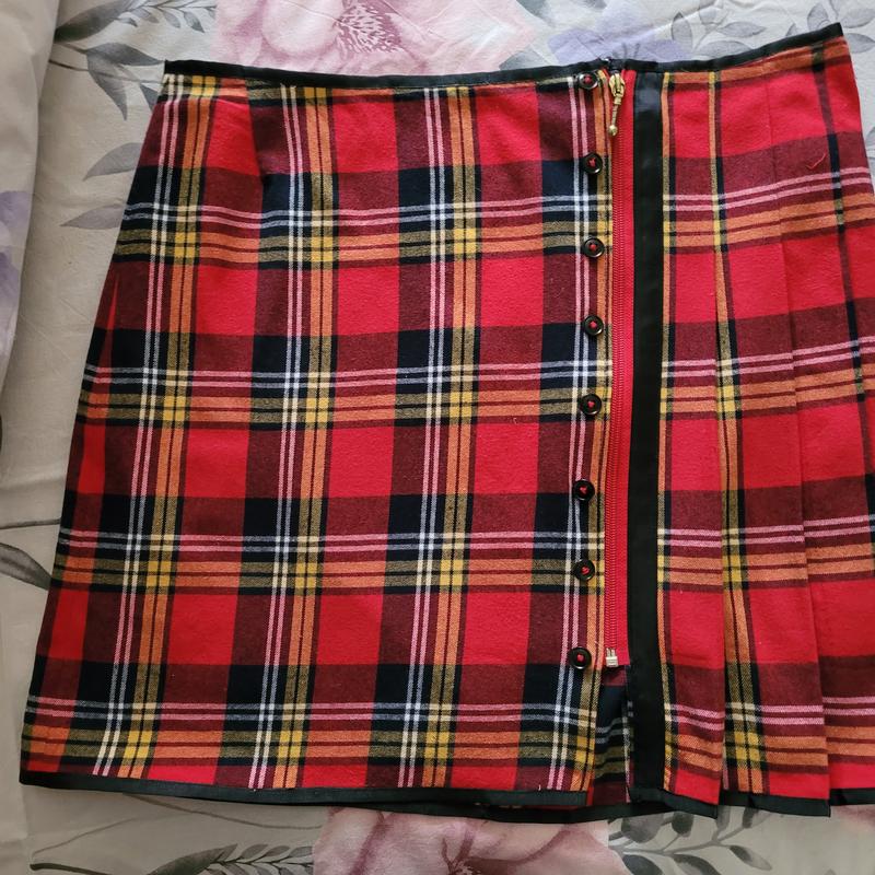 Недлинная юбка в клетку из клубевника Размер 48 укр. С асимметричной застежкой на молнию цвет красный Отделка тесьма и пуговицы