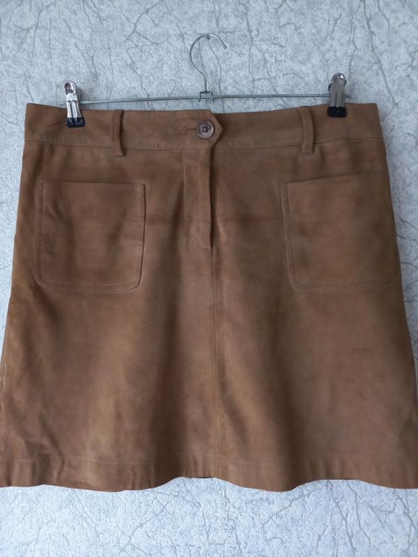 Красивая замшевая юбочка из кожи козы (фо бирки). Тренд этого года. Стан идеальный.Фото не передало качественно замша емкая емкая, мягкая, качественная выделка.Длина 46см, пот 42см, поб 50. Имеет два кармашка спереди и два сзади.