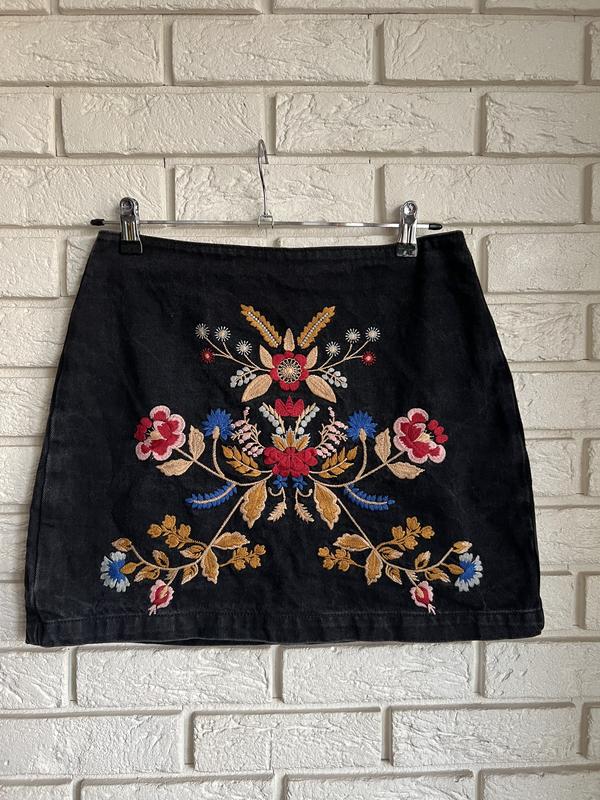 Джинсовая юбка с вышивкой спереди. Размер М, Ширина по поясу 38 По стегнах 51 Длина 40