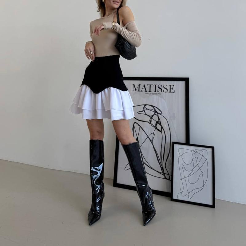 #Юбка Артикул: 942-5628 Цвет: черный и беж Размер: S,M,L,XL Материал: верх джинс бенгалин, тянется очень хорошо, со шлевками, застегивается юбка на пуговицу и молнию Рюши софт очень приятный на ощупь, не просвечивается